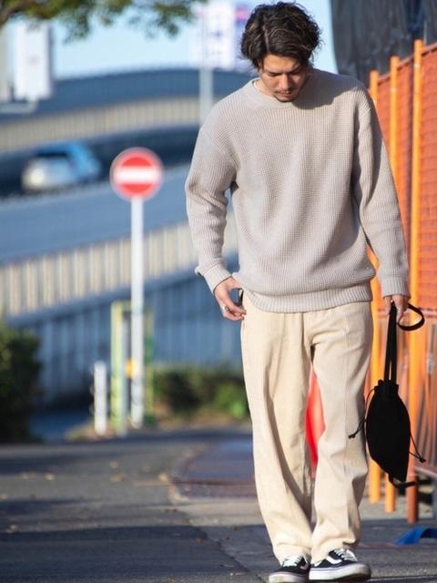 米色燈芯絨長褲是本季不可錯過的推薦款,由於淺色調能為冬季穿搭調和格外搶眼的層次焦點,即使不擅長搭配也能輕鬆展現理想樣貌,以淺色針織毛衣混合呈現一致性的和諧美感,換上深藍色毛衣立即帶來令人為之一亮的街頭風範。