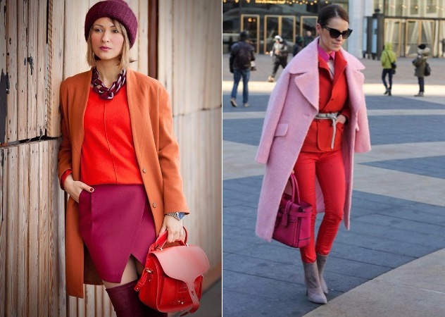 橘紅色系是個單穿有點難駕馭的顏色,所以在配色上可以選擇相近色系做搭配。像是橘紅色尚配上紫紅色的裙子和駝色外套(左),看起來很有變化卻又不突兀。簡單一點的搭配法則是都帶點紅色系,局紅套裝搭上粉紅大衣和桃紅包包(右),就算身上很多顏色看起來也很協調!
