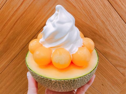 可以一個人獨享的哈密瓜霜淇淋,在這裡就可以吃到!將半顆新鮮哈密瓜果肉挖出球狀,再擠上北海道牛乳霜淇淋,再將一球球哈密瓜果肉點綴在霜淇淋四周。怎麼可以不先拍照100張再吃?!