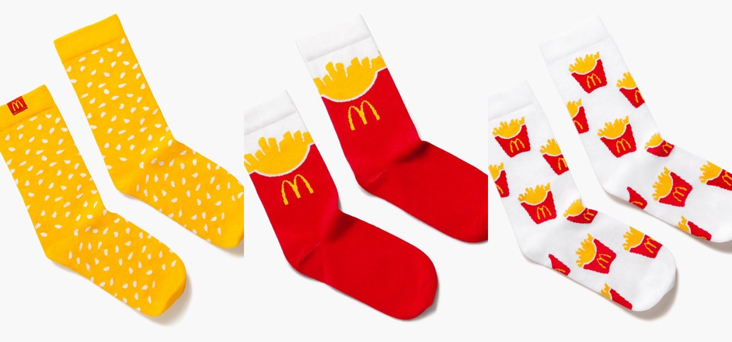 你覺得穿一整套有點害羞嗎?儂編Got you!若是如此就從小配飾來!儂編私心推薯條襪襪,真的可愛到不行~元氣少男少女應該來一雙吧!而圖左是這次的新款印花,黃底上一點一點的就是芝麻籽,一想到它是漢堡上的芝麻籽儂編就覺得餓了......。平時看市面上好多薯條襪的高仿,這次人家都出正品了還不跟上嗎?!