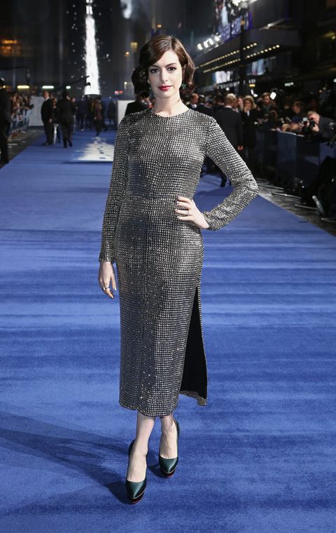 2014年擔任奧斯卡頒獎嘉賓的安海瑟薇,選擇Gucci的緊身禮服出席,開衩跟露背設計讓她性感無比,由寶石裝飾上身如同盔甲般搭配俐落短髮英氣十足。