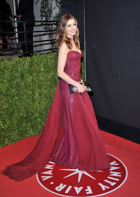 2008年的奧斯卡穿上Marchesa的紅色斜肩禮服,拖曳的裙擺肩上有細緻的玫瑰設計,讓安海瑟薇如同希臘女神般降臨紅毯。