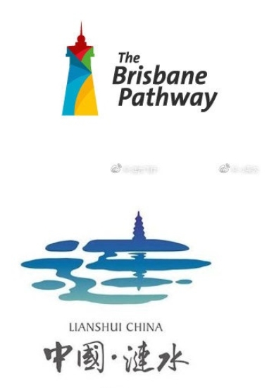 另外,網友指出這張圖的「燈塔」部分,和澳洲布里斯本的LOGO十分相似;藍色的「連」與「中國‧漣水」的LOGO也高度相似。看起來就像是把兩張圖疊在一起略加修改混合而成的。