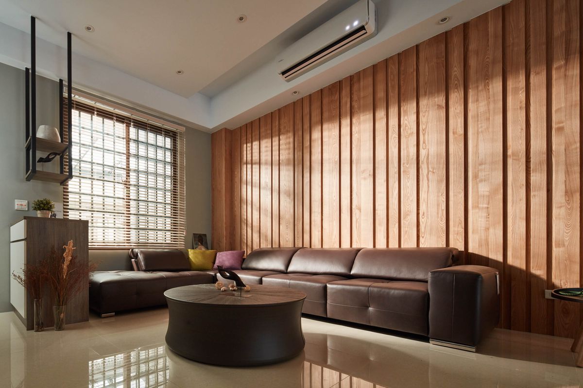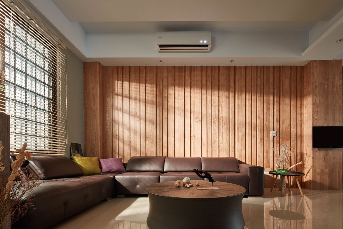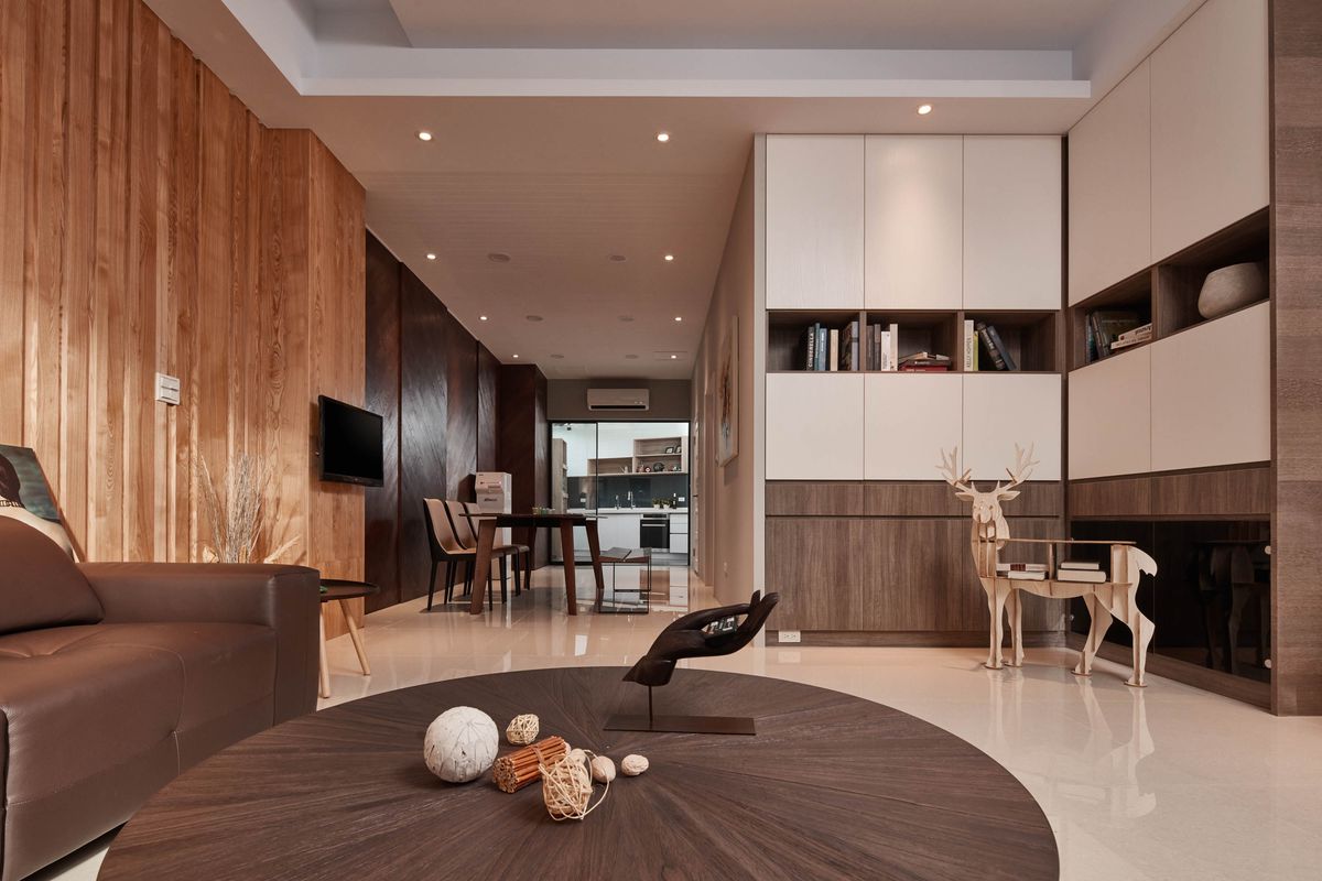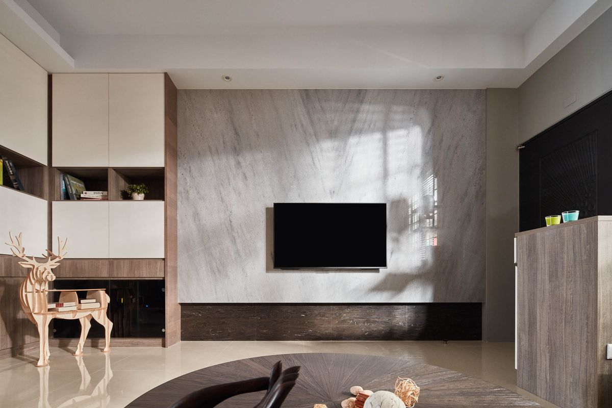 設計師將視聽設備妥善收整於收納櫃中,並透過整面大理石打造的電視牆使客廳視覺更為清爽乾淨,同時放大整體空間感。材質色調上以沉穩中性的木質為主,客廳背牆選用顏色較淺的栓木實木貼皮,在牆面上切分出粗細不同的溝槽線條,揉合自然光源,質樸溫馨的公領域空間便悠然而生。