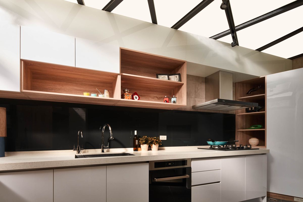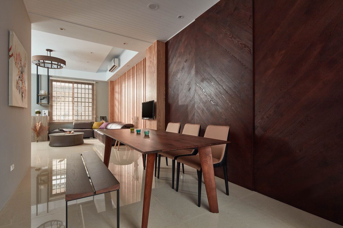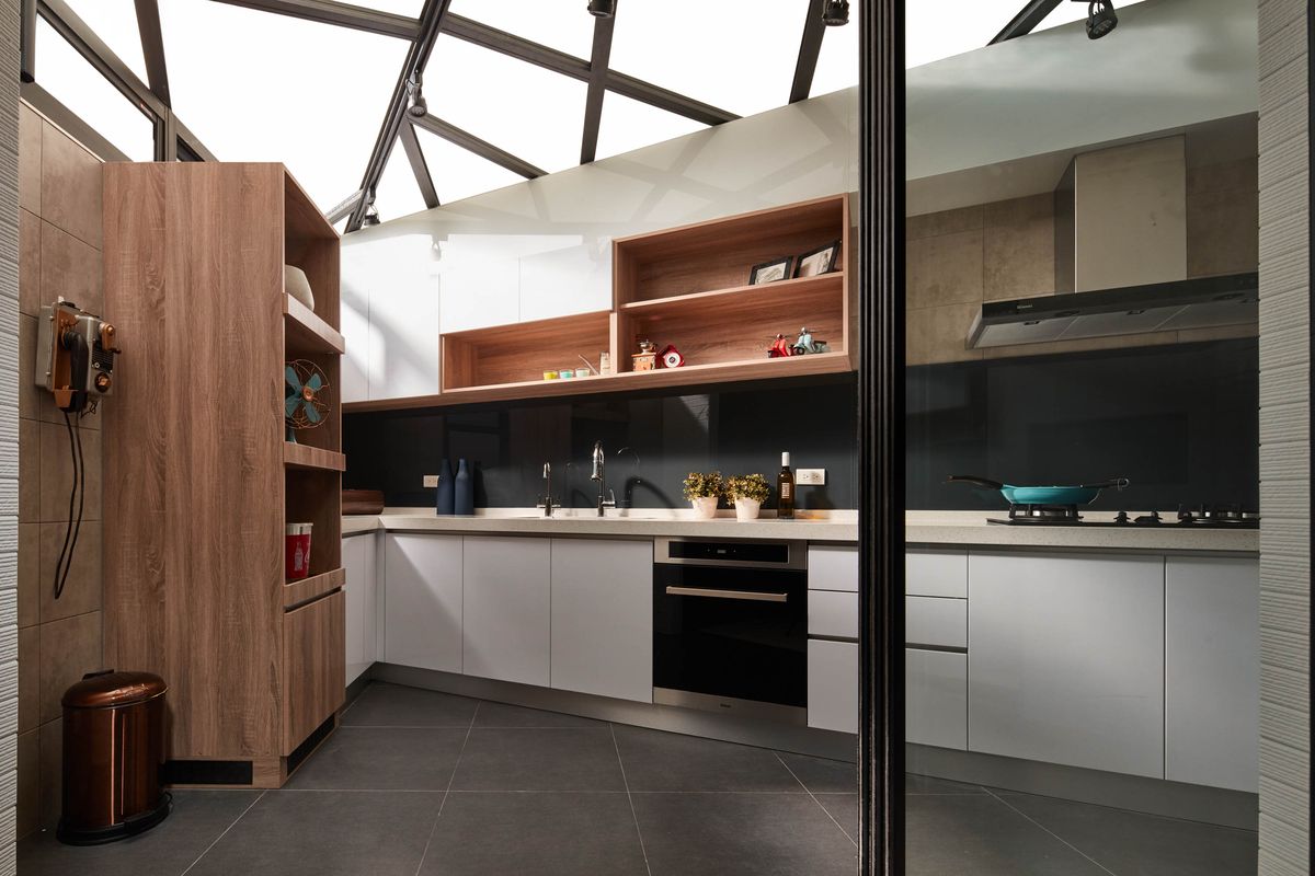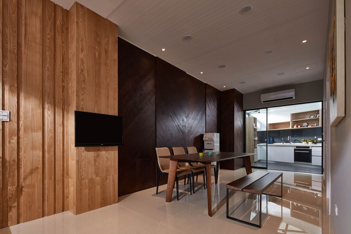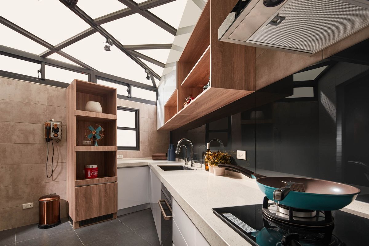 設計師將餐桌背牆以木皮染深,再利用人字型對花豐富壁面層次,與客廳區形成開放式空間,在生活場景運用上可以有更多變化。廚房外部圍牆加高並設置氣密窗,天花採用透光性極佳的採光罩,打造出一個寬敞陽光的料理空間,也因應斜角的畸零地形規劃廚具設備。倒角式的配置,則令料理動線更為順暢自然,並以玻璃拉門隔絕室內外空間保有隱蔽性,使料理成為一件專注且美好的愛好。