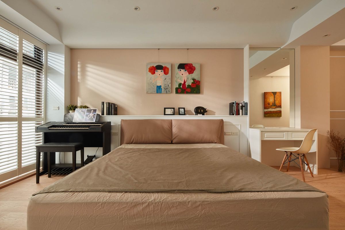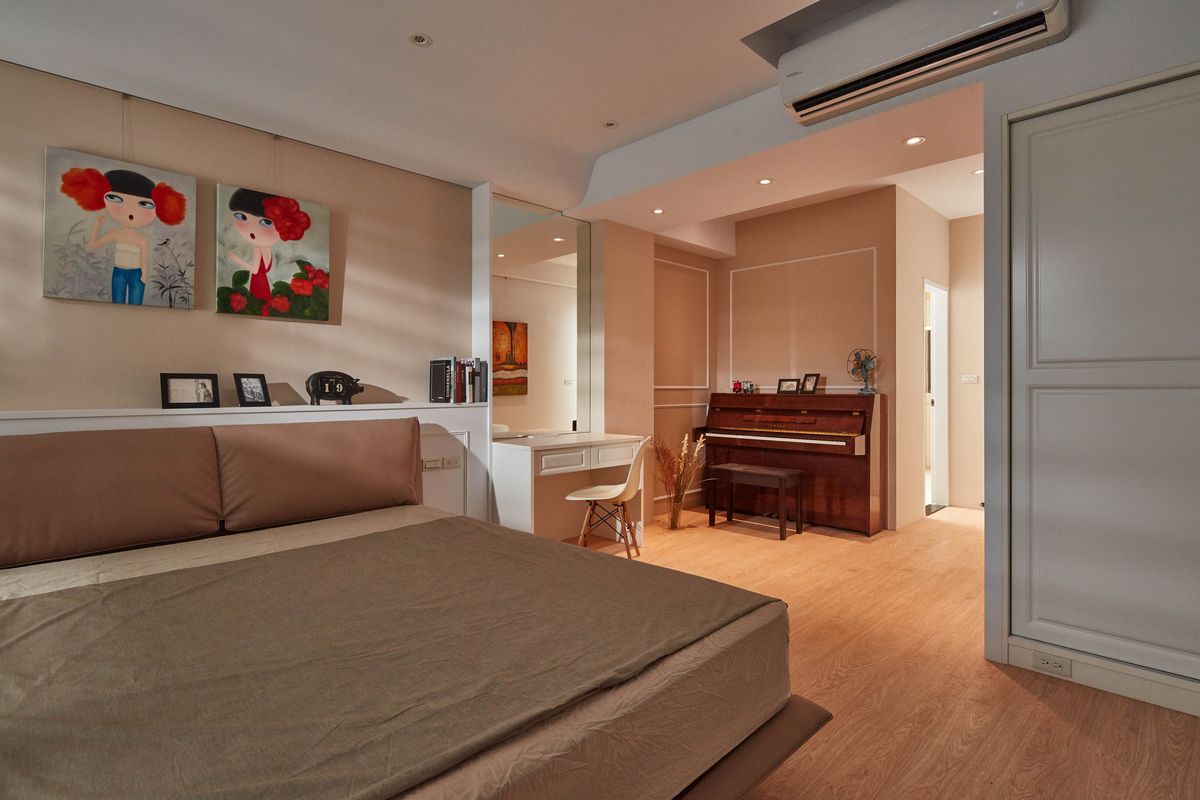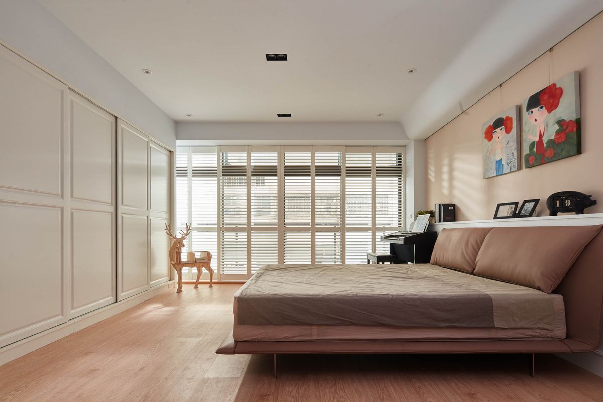 私領域的長輩房以溫潤木質為基調,利用整面純白收納櫃體豐富空間機能,也令環境視覺更為美觀舒適。因本案和其他建築棟距較小,開窗就能看見對面的鄰居,考量隱私性,在既有的落地鋁門窗外,以實木百葉裝飾,解決了棟距問題,亦創造出淡淡復古氛圍的浪漫窗景。設計師將原本自地自建的住宅重新改造,格局動線加以規劃重整,引充沛陽光入室,打造滿足全家人的幸福居住空間。