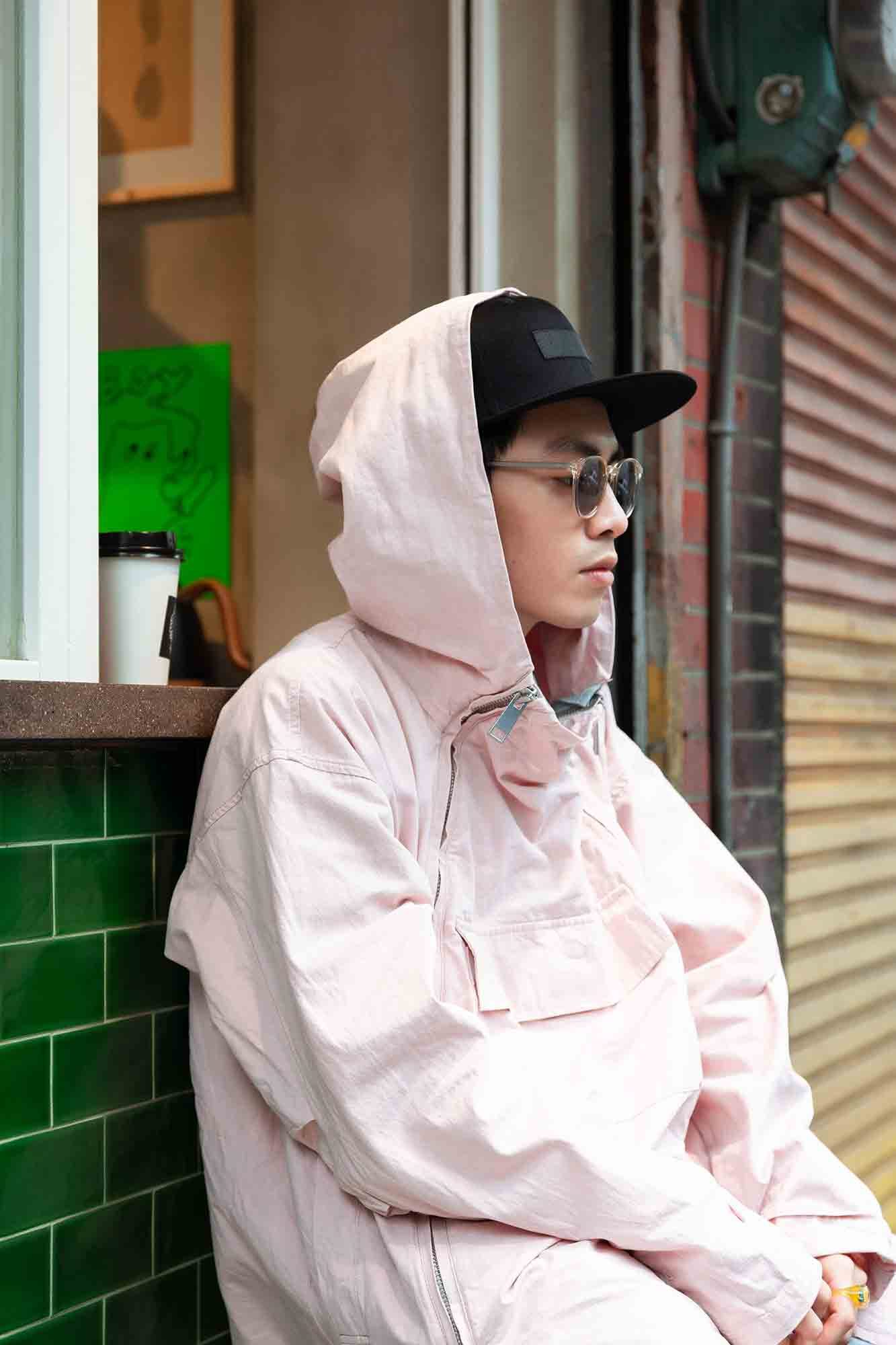 「第一眼看到 (A)NOWHEREMAN 與 NEW ERA 聯名的黑色帽子,我直覺是『硬派』,帽子是在上半身,下身就以材質稍硬的褲子,還有比較厚的 HOKA ONE ONE 鞋,傳達「硬派」的主題。「全身太過強勢不像我,」藍德說:「外套與襯衫的材質就會比較軟,做為調和。」不過,最吸睛的要是藍德有畫眼影,而且上下都有畫,「你發現了(大笑),因為晚上要錄影,我用咖啡色打底,再暈染紅色,眼尾稍微往上拉,有很明顯嘛!」
