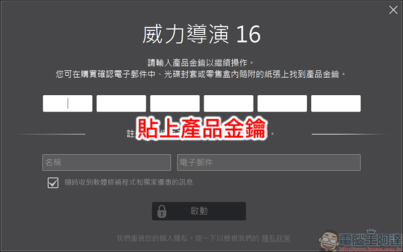 這時畫面會出現產品金鑰的登錄頁面,接著只要貼上活動頁面或信件中取得的產品金鑰貼上,便能直接完成軟體授權: