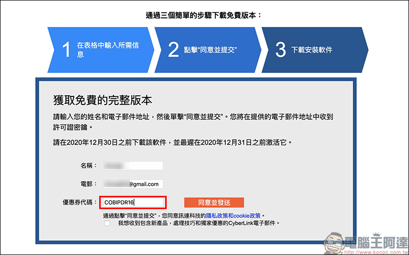 接著在頁面輸入名稱和 e-mail ,並輸入優惠券代碼「 COBIPDR16 」,接著按下同意並發送。此時頁面會顯示產品授權金鑰,系統也會同步發送信件至用戶輸入的 e-mail 信箱。前往收信點擊信件中的下載連結,即可下載軟體: