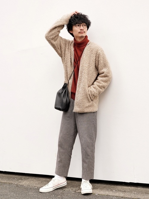 紅色的高領毛衣搭配起米色刷毛外套,是更加進階的復古穿搭配色,下身的灰格紋褲可以延續這樣的復古印象但又不會搶走上身的配色焦點,是想初次嘗試高彩度配色的男士們值得參考的顏色組合。