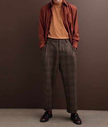 除了百搭的灰色格紋褲外,更利於營造出復古時髦印象的咖啡色格紋褲亦是男士們不可放過的冬季定番。在面對格紋寬褲時,不妨盡量選用暖色調的上身來搭配,棕橘、棕紅、鵝黃等等,隨性變化出符合季節感的時尚。