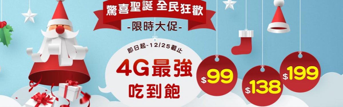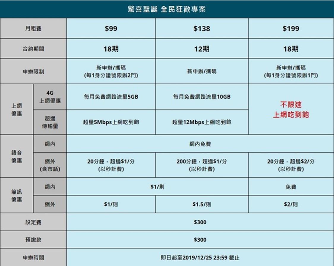 雖然各大電信業者正為5G競標如火如荼,不過兩小業者為提前搶用戶,優惠方案不斷。繼台灣之星與亞太電信推出雙12優惠活動外,為歡慶聖誕節,亞太電信推出「五告讚99單門號方案18期」、「尊享138上網吃到飽(12Mbps)單門號方案12期」、「飆網199上網吃到飽單門號方案18期」三個聖誕節限時方案,上網吃到飽最低$99起。