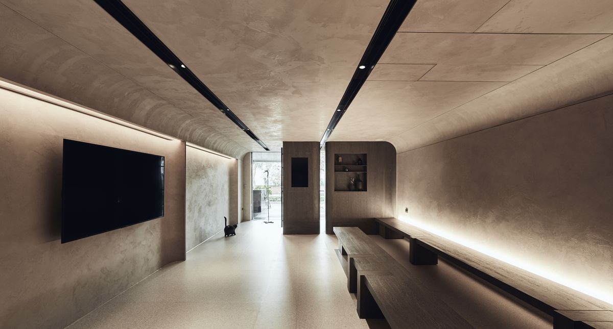 使用土壁作為空間的重要元素,土壤的溫暖色澤與紋理,是烙印在生物基因裡的。從文明發展前的石器時代到近代,人類的居住模式才從穴居漸漸向外發展,而當人或動物靠近土壤,心依然本能地感到踏實。壁面的紋路及色調,傳達了原生感,而被弧型壁面溫暖包覆的這個空間,及存在在空間中的我們,亦感到沉穩安寧。