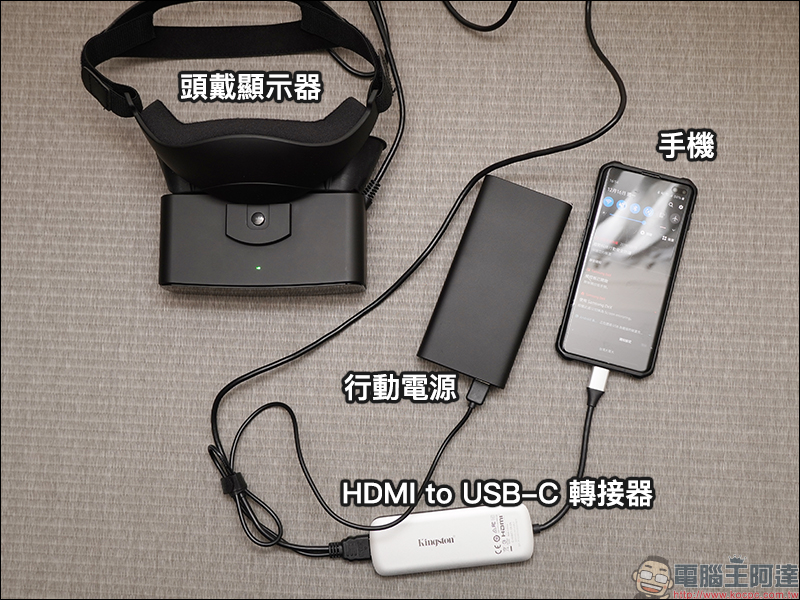 假如各位想使用智慧型手機看影片,先用轉接器連接 PHOTONTREE X 的 HDMI ,接著連上 USB 充電器或行動電源即可使用。實測無論是 iOS 或 Android 系統的手機都能在 PHOTONTREE X 頭戴式顯示器上看影片:
