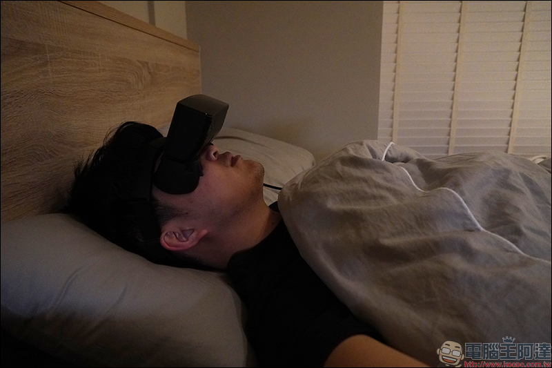 連接電源並開機,此時機身頂部的指示燈會亮起,接著可開始由機頂頭戴式顯示器最舒適的觀看距離,頭戴的鬆緊度也能一併進行調整: