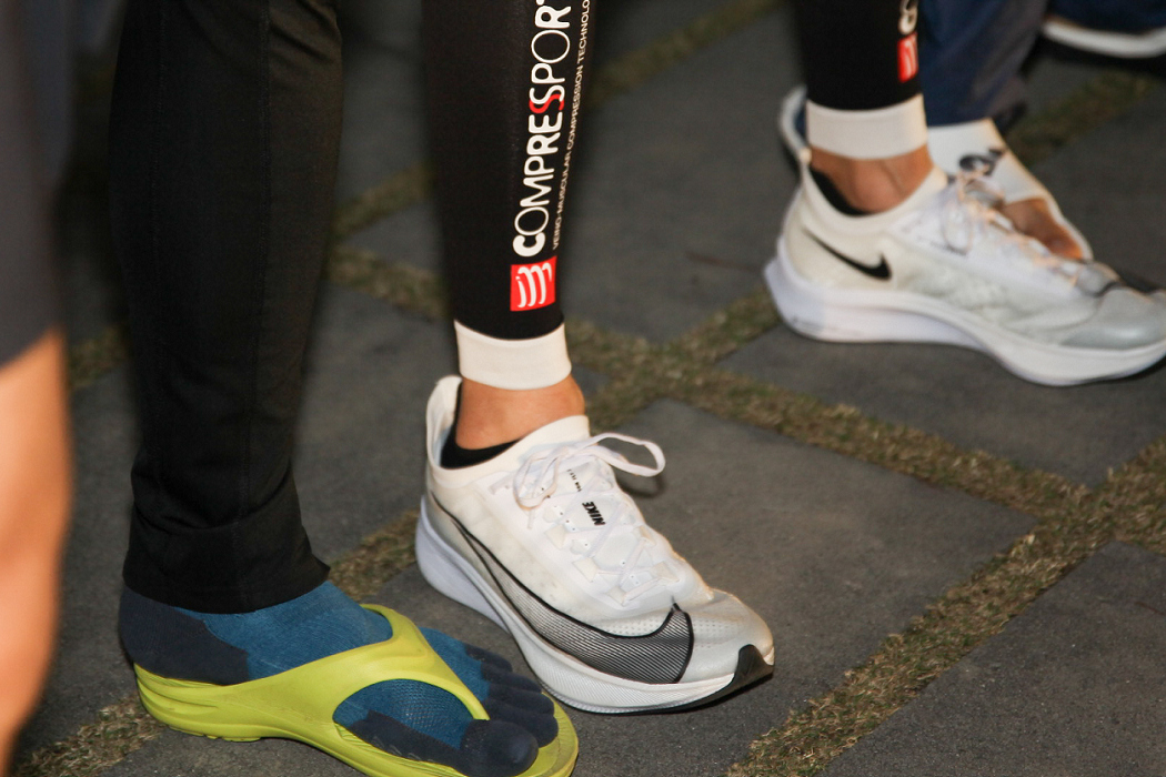 HOOD to COAST 除了有三五好友相揪報名的跑友組外,來自大專院校學生共組的畢業玩轉學分組比例也相當高,尤其與不少年輕跑者閒聊發現大多是 Nike 校園大使,年輕活力帶給 HOOD to COAST 不少歡笑。而鞋款方面也有新血加入,在 Nike Breaking 2 計劃帶出 Nike Zoom Vaporfly 4% 新世代後,中底後跟翹起的線條已成為旗下跑鞋趨勢,之後如 Zoom Fly、Zoom Fly SP、Air Zoom Pegasus 36 到近期的疾速系列 Zoom Fly 3、Zoom Pegasus Turbo 2,以及新旗艦跑鞋 ZoomX Vaporfly NEXT% 都在後跟處收起高高弧線,而 HOOD to COAST 上又以 Zoom Fly 3 和 ZoomX Vaporfly NEXT% 最受跑者喜愛,兩者共通點是都在中底含有碳纖維支撐片,幫助推進上更有力的串連前後腳掌。