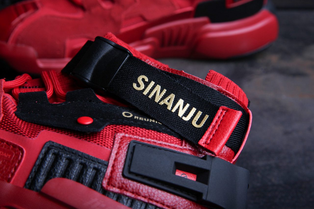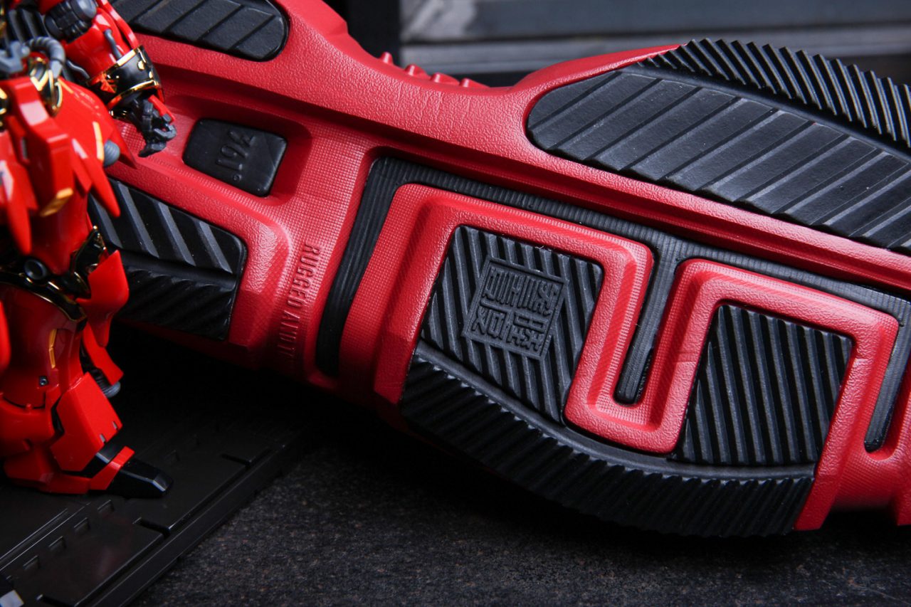 這一雙鞋款以生活穿搭為主,所以鞋身材質以舒適度為取向,用針織襪套包覆的鞋身,加上皮革、網布的層次交層,像是盔甲般的保護著。而皮革邊緣的紅色線條,勾勒出獨角獸的精神感應框架,小細節上也十分用心,鞋面印著 機動戰士UC 的 Logo,下方縫線還考慮著進氣孔的黃色車線,後跟的 TPU 更帶有鋼彈的機能感,也有點未來感的弧線與異材質結合,更多「鋼彈感」。
