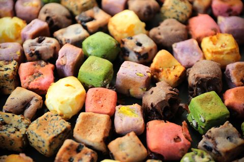 靈感來自爆米花,麵糰裡加入如抹茶、火龍果等5種天然植物色粉,色澤繽紛,口感Q軟,盛裝在爆米花紙杯中,勢必成為看電影的新寵。
