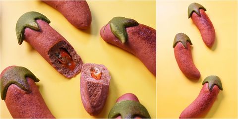 把整根新鮮辣椒直刀開肚、去籽後,包入以朝天椒、花椒等打成的乳酪餡,再整根辣椒包裹上以甜菜根染成紅色的類白吐司麵團,鹹香微辣的口感非常迷人。若你是超級嗜辣族,主廚推出限量版「斷魂小辣椒」麵包可以來挑戰,現場很幽默的提供冰水一杯讓你可以急救滅火。