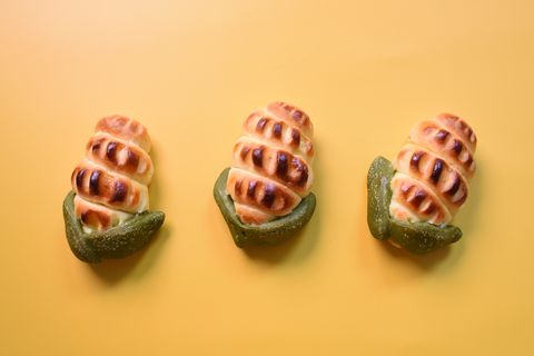 以日本照燒醬煮玉米筍入味,再以布里歐麵包包裹,外表用小刀刻出玉米和玉米葉的紋路,出爐後,口味神似燒番麥。