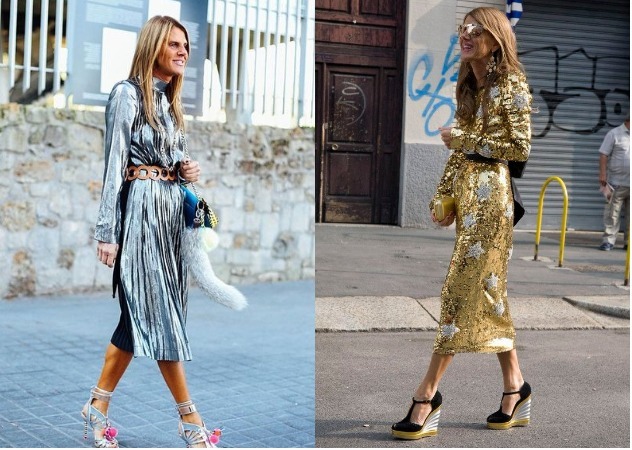 首先、小編特別找了時尚界的「浮誇女王」Anna dello Russo為大家示範金屬系穿搭。(左)銀色百褶洋裝,套件毛衣或開襟外套,日常生活真的可以穿!(右)金色亮片星星洋裝最適合派對場合,一定是目光焦點!