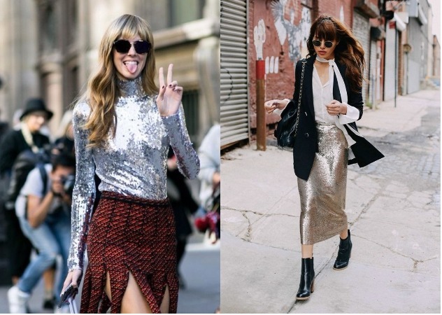 有發現這組穿搭都是「金屬系下身+素面上衣」嗎?(左)不規則亮片裙搭配露肩襯衫和天藍色襪靴,簡直仙女下凡,參加派對、男人都想跟妳說話!(右)銀色最適合搭配淺灰色,打造成潮人最愛的All-Gray時尚造型,低調又不減氣勢!