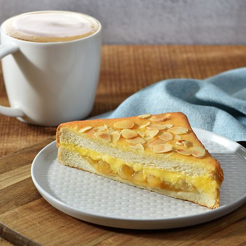 以蜂蜜吐司夾入飽滿滑順卡士達醬,包裹紐西蘭蘋果丁,表面的杏仁醬及杏仁片帶出果仁香氣。嘗來香甜不膩果香十足。冬季檔期限定上市,錯過機會不再。NT75