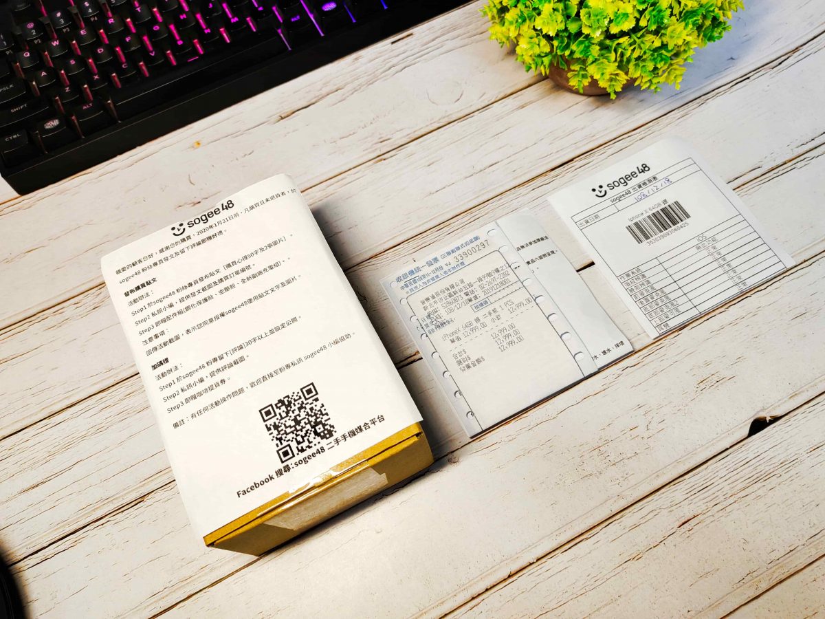 由於 Sogee48 是由業界著名的智樂通股份有限公司所創立的交易平台,因此對於首次在 Sogee48 購買手機的我來說,並不會擔心買賣是否成為詐騙。收到包裹之後第一件事則是先檢查發票上的金額是否正確,接著才是針對手機等內部狀況進行測試。