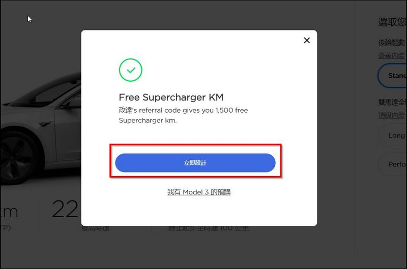 如果您看了這個系列後還是決定訂車的話,只要點擊由我提供的連結或購車時使用我的推薦碼『koc59401』下定的話,你跟我都會得到 1500 公里的免費超充,你自己去官網定或現場選車反而沒有,如果說您身邊有親友想買TESLA的話,也拜託賞個臉,感激(網路訂車後廠商還是會邀請你去現場看車,定金也都可以全額退,大家放1000個心)。