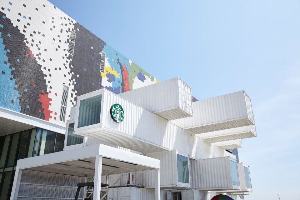 全台第一家「貨櫃屋星巴克」落腳花蓮!洄瀾門市坐落於迎接太平洋面升起之第一道曙光的花蓮洄瀾灣,門市建築本體由知名設計師-隈研吾設計,以貨櫃作為建築素材,透過大樹開枝散葉的設計意象,懸挑航遍全球各大港口的貨櫃,賦予循環重生;並結合中式斗拱的力學基礎,打造層層穿插的貨櫃空間。內裝設計上,花蓮洄瀾門市以保持貨櫃原始風貌為主,僅在部分牆面裝飾木皮板亦運用了在地阿美族原住民的鮮明色彩點綴,展現了星巴克深耕在地,體驗星巴克門市特色的不斷創新及多元性。