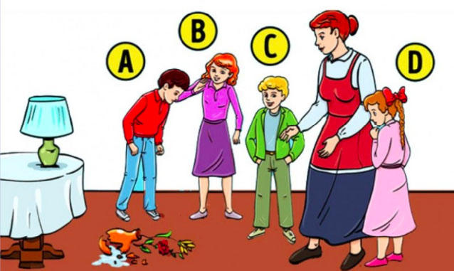 在此圖中的小孩 A,的確最像是打破花瓶的人,他雙眼下望並看似有後悔之意。不過,由於 A 的位置最靠近花瓶,而且是唯一跟其他人面對不同方向的人,故也不能排除,其他人可能聯合起來指責他,他可能是團體中時常被冤枉、誣賴的人。