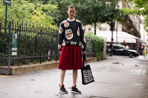 俏皮的印花上衣與紅色百褶裙的相結合,充分展現青春氣息,而內搭的白色襯衫更是為整體造型增添層次感。