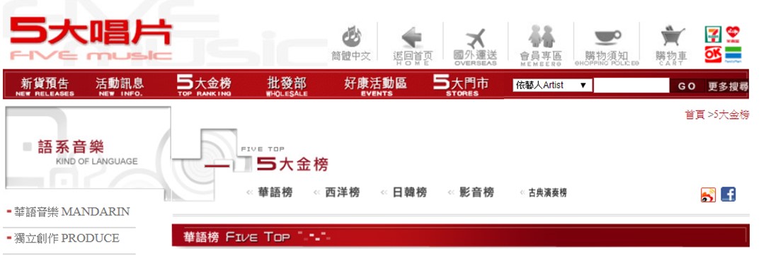 【五大唱片金榜】為一專輯銷售榜包含綜合榜、華語榜、西洋榜、東洋榜、爵士榜、古典榜、影音榜、外語榜(西洋榜、東洋榜合並計算)等20名榜單,其中提供本周名次/上周名次/專輯名稱/藝人名稱/最高名次/進榜周數/製作發行/銷售百分比。該排行榜以專輯的銷售數量總和作為一統計依據,賣出多少張數就會累積到記錄中,但單曲及綠標搭配性促銷商品不在台灣風雲榜計算之列。銷售排行榜計算方式是計算每周五至隔周周四午夜2點,每周五下午六點前在其網站公布出爐當周最新榜單。