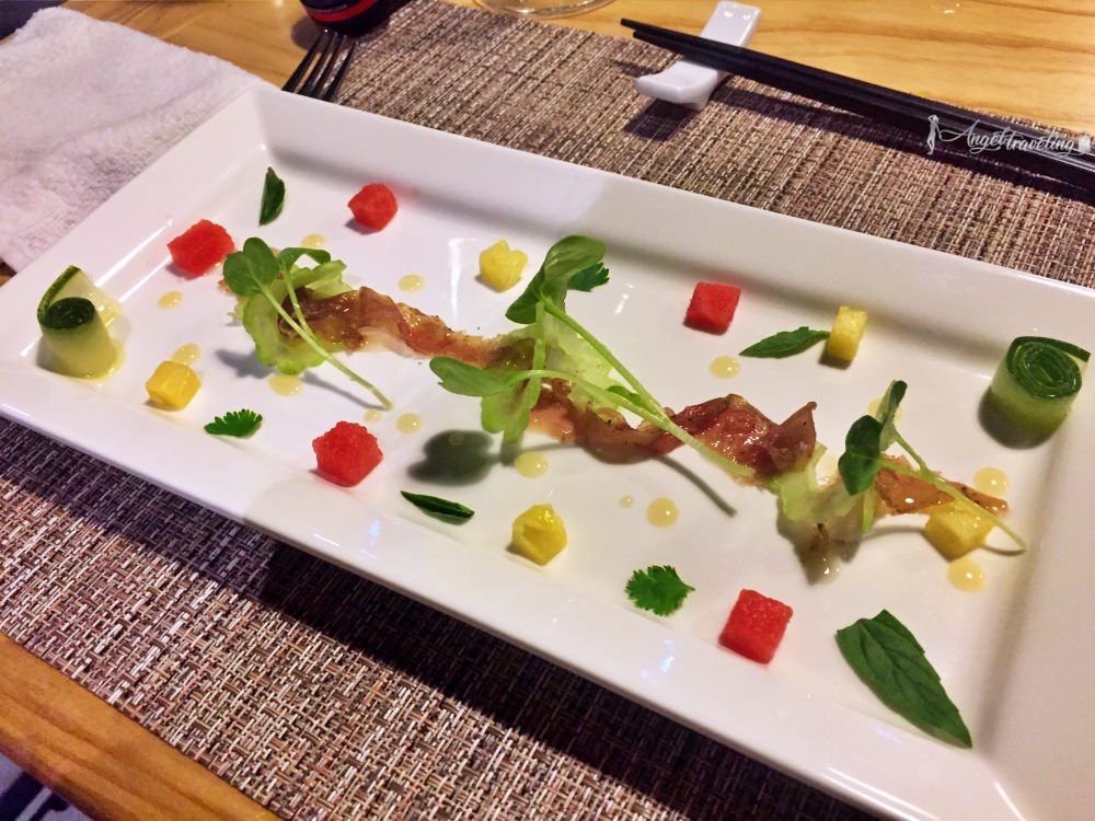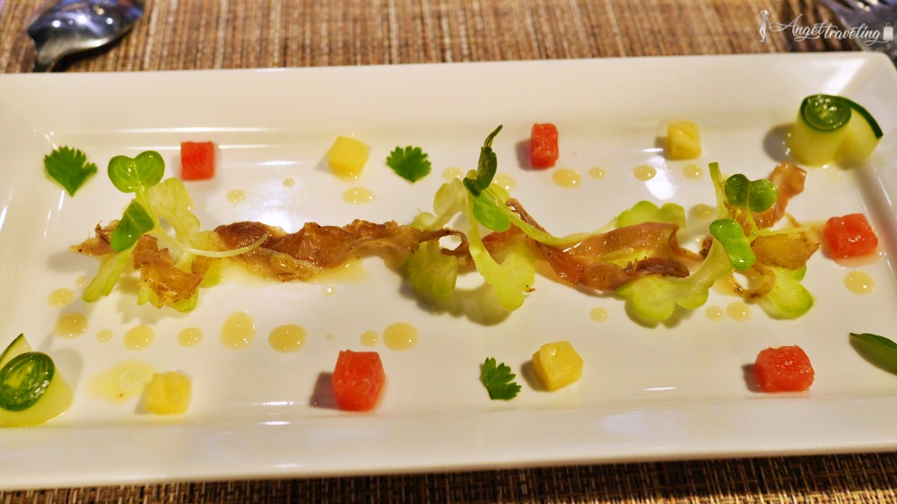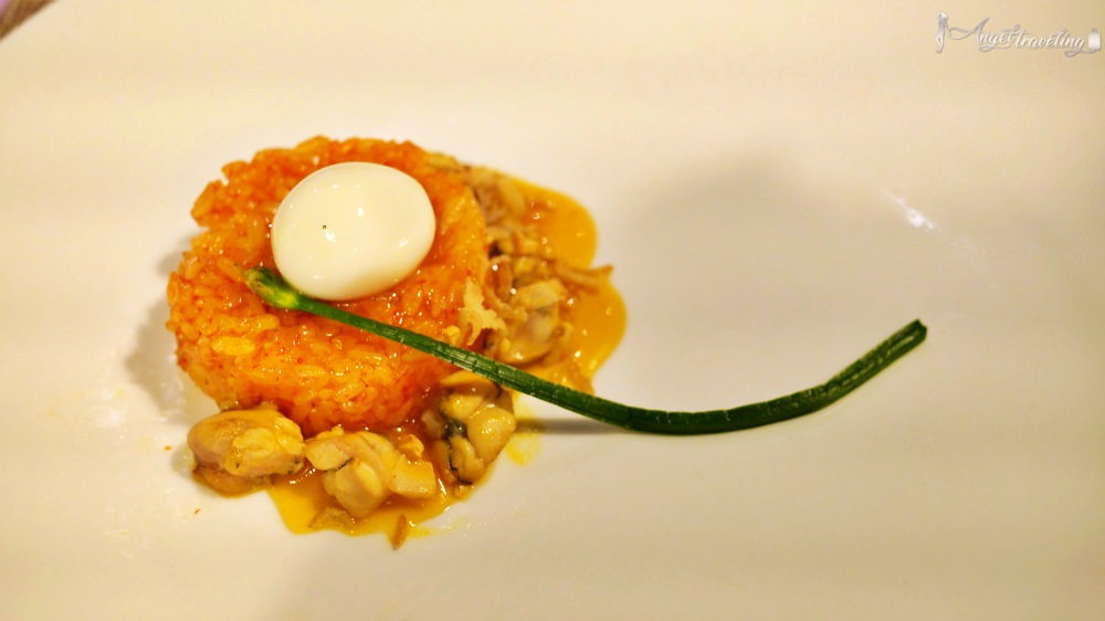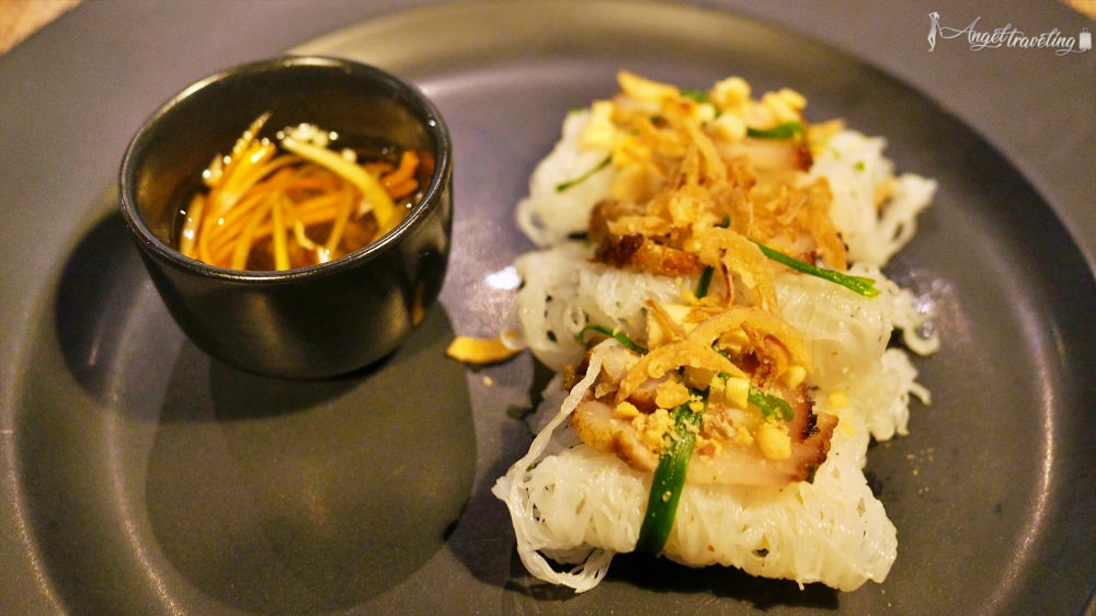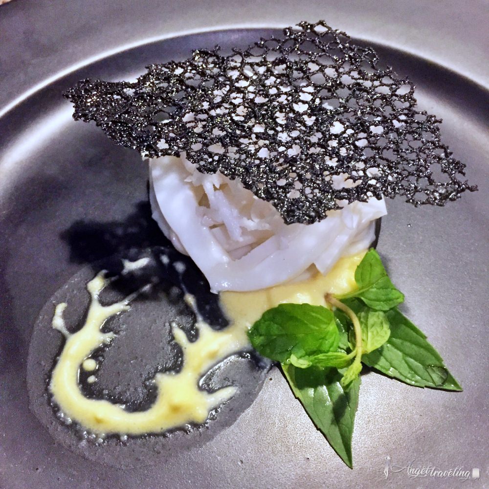 送來的時候完全猜不透是什麼東西,原以為是越南米線製成的前菜,結果咬下去口感竟然是脆脆的,原來是把“透抽”剁細成像麵條形狀,再加上魚油和蛋蛋芒果味,甜鹹的口感,我個人覺得是全部裡面最有創意又好吃的料理