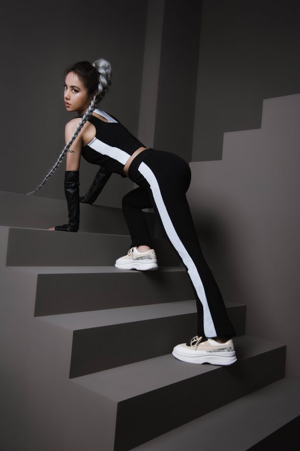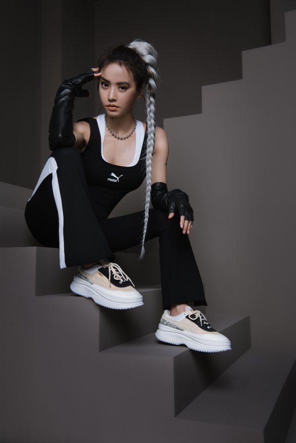 2020 年由流行天后 Jolin 所領軍的新龐克女力時尚以 PUMA DEVA 拉開序幕,在霸氣厚實大底的堆疊下,Jolin 一襲夜幕黑 PUMA Classic 勁裝登場,PUMA T7 小喇叭緊身褲獨特側邊邊條設計延伸腿部線條,搭配超合身 PUMA 復古短版背心加乘視覺顯瘦效果,姊的霸氣瞬間秒懂。