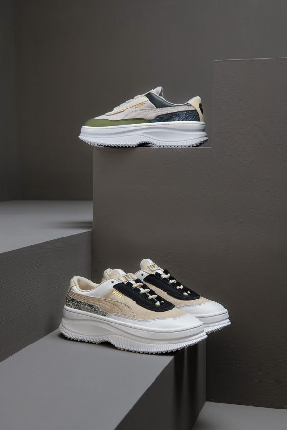 這款大有來頭的 PUMA DEVA 早在 2019 年 11 月底的 PUMA x Balmain 高端聯名系列中即首露曝光,更是國際超模 Cara Delevingne 獨鍾新寵,限量版 PUMA DEVA by Balmain 甫推出旋即造成全球時尚圈的熱烈迴響,在社群平台上的討論度更是高居不下。2020 年,PUMA 正式祭出全新厚底美學 2.0 – PUMA DEVA,以新龐克女力出發,霸氣為女孩們的每一個步伐加足厚實力量,為每一次的華麗現身帶來震攝全場的絕美氣場。PUMA DEVA 採用流線型厚底鬆糕狀大底,拉長腿部線條,超模比例渾然天成,以頂級麂皮鞋面柔軟打底,後跟纏繞野性動物紋皮革盡顯低調奢華,高調彰顯叛逆不羈的龐克 DNA 和渾然天成的厚實時尚底蘊。