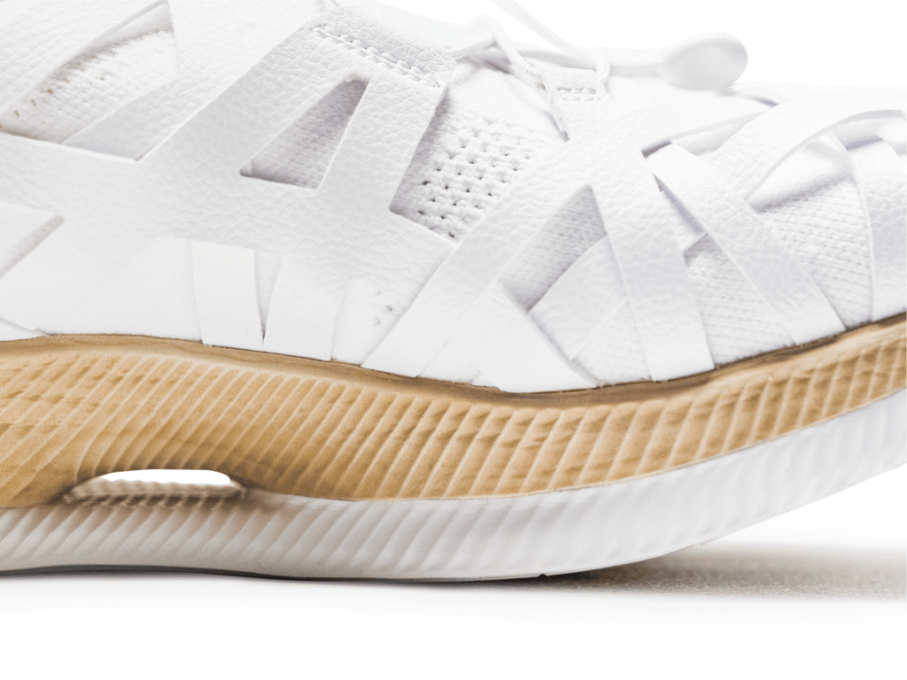 - 柔韌針織鞋面:取材自傳統日式竹編工藝,交錯的條帶形狀材料包裹雙足,為運動提供穩固又不乏彈性的支撐。