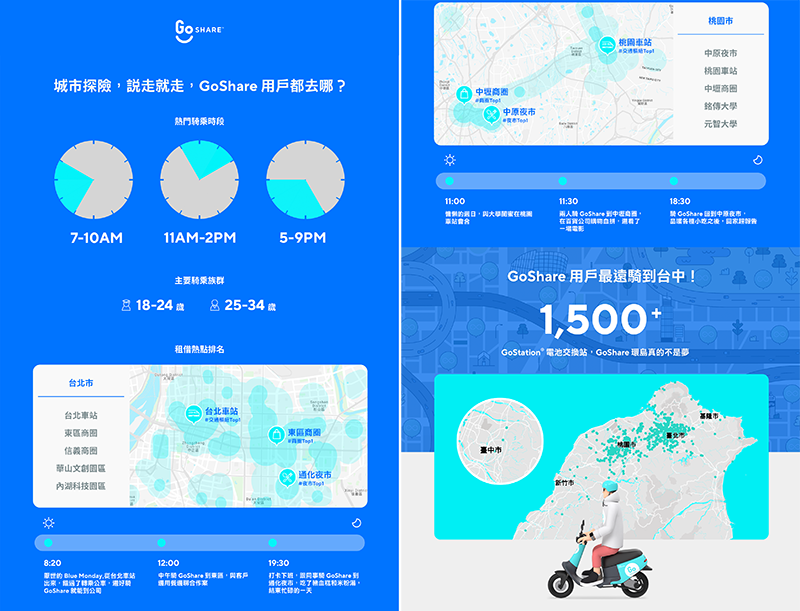 GoShare 還分享了一些有趣的資訊,包括熱門的騎車時段 / 租借熱點、主要的使用族群等。不得不說,這個主打超快速就可以透過 AI 審核資格的共享電動機車服務,的確有其吸引人之處。GoShare 在新聞稿最後也提到,明年他們也將持會帶來更多加速電動化革命的各種驚喜,真令人好奇還會有什麼有趣的共享玩法呢?