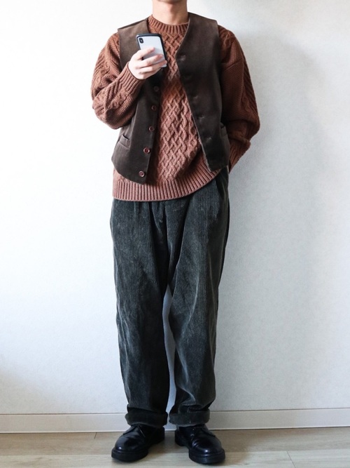 平時也熱衷於穿搭古著的朋友,也不妨運用同色系,將 Vintage 感的背心外搭在麻花針織外,替上身的造型印象再次加分。