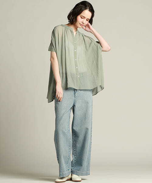 稍微露出身體肌膚的透膚材質給人一股微性感的氛圍,但也可利用休閒的服裝剪裁以營造出兼具率性與性感的風格表現。以透膚短袖襯衫搭配直筒牛仔褲,便能使整體中性感之餘又不失女人味印象。