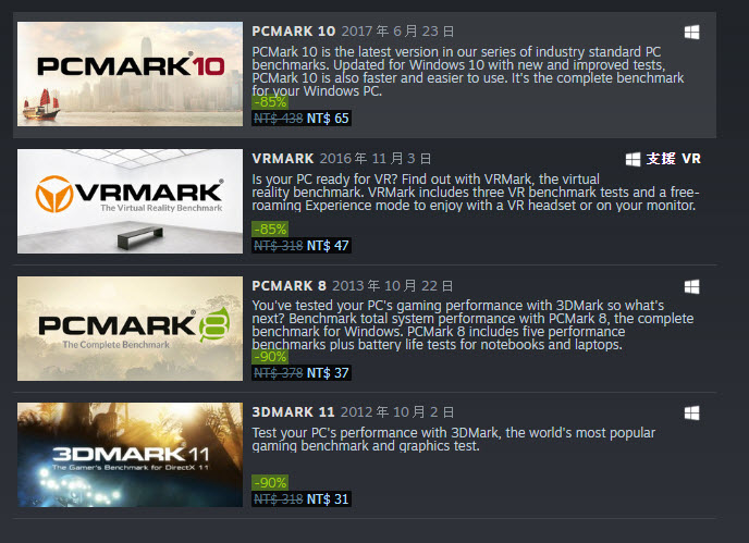 「PCMark 10」、「3DMark」與「 VRMark 」 Steam特惠頁面