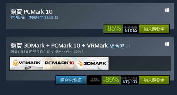 針對一般使用者,「PCMark 10」、「3DMark」與「 VRMark 」有提供基本免費版,不過若想確認更多測試,付費進階版會是一個更好的選擇,但平常3百多快4百元的價格,可能仍會讓人遲疑幾下。然而在這次「PCMark 10」、「3DMark」與「 VRMark 」進階版於Steam的特賣中,從1.5折下殺到1折起,單款軟體幾乎都是50元有找,要是購買「PCMark 10」、「3DMark」與「 VRMark 」組合包,也打11折從原價1194元變成113元,可說相當優惠。