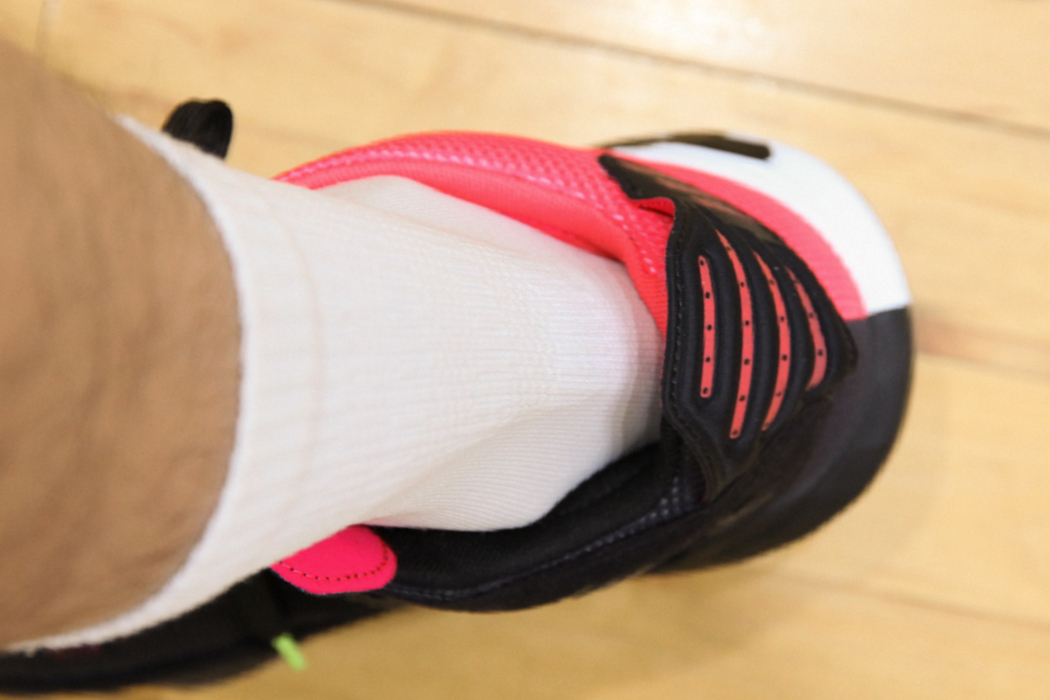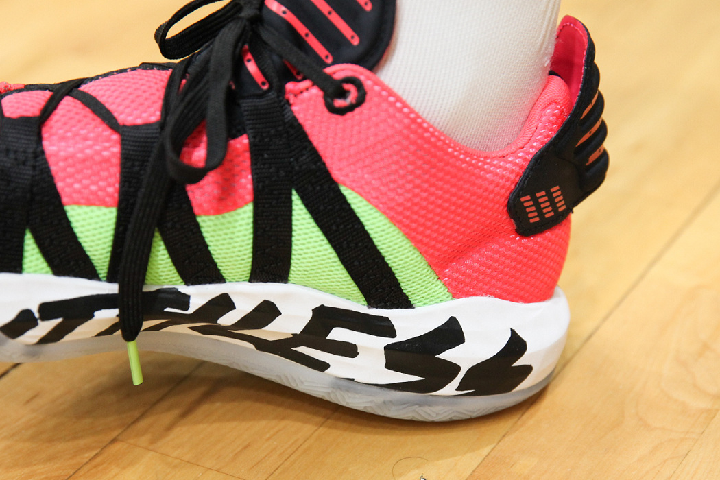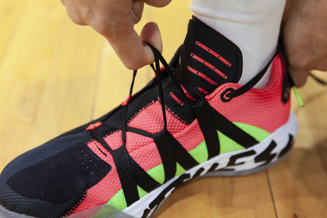 正因為是比較好練習的慣性動作,所以成為籃球場上很常見招牌,其精髓在於身體重心壓低,腳步跨大能減少失誤發生,或更進階變成背後運球都能在跑動間快速變換方向晃過防守者。而 adidas Dame 6 雖然鞋舌與後跟拉環都偏長,不過在穿著長襪的狀況下不會有異物感。