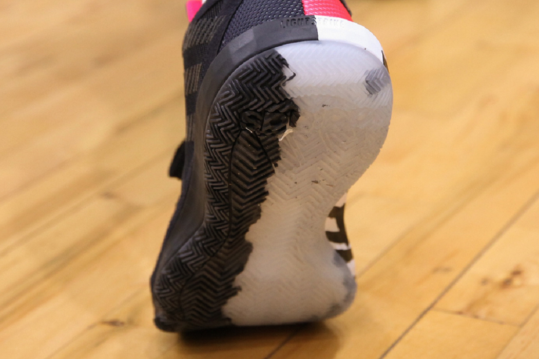 抓地力是 adidas Dame 6 上意外收穫,在拿到實鞋時還研究大底兩區塊顏色是否使用兩種材質組成,結論是透過染色產生的視覺效果,性能上沒有太大差異。而水晶大底在當天木質地板上展現說停就停的好表現,不論是直線衝刺或側向煞停都即刻到位,另外還要稱讚的一點是雖然材質容易沾黏灰塵,抓地力卻不會因而大打折扣,編輯是直到打完球脫下來時才意識到原來大底已經如此髒,也讓人期待室外場表現,至於耐磨性方面想再多打幾場等完整了解 adidas Dame 6 時再跟各位分享。
