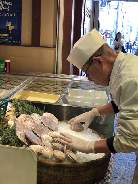 在京都人的廚房:錦市場裡,有一個從大正十年(西元1921年)即開業、名為「大安」的海鮮生蠔吧,聞名遐邇,每日從正午開始營業,大約11點半之前就會有人開始排隊,菜單從生蠔、生魚片,到炙燒的扇貝、螺類,最簡單的美味從好食材開始;我們坐在碳烤爐前,老闆不急不徐。