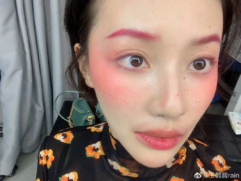 王鶴潤說只要妳敢跟化妝師開口,沒有什麼妝是不能完成的,而化妝師也在她的要求下完成了粉紅夏日妝,把眉毛塗成了桃紅色,大面積的畫上腮紅至太陽穴,口紅則是隨意抹出暈染感,是不是怪的很有個性.