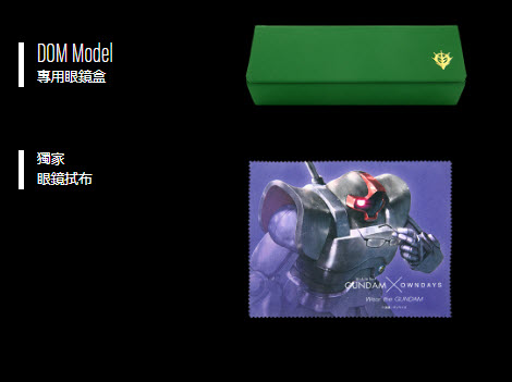 「德姆聯名款」,採深霧灰的鏡框,搭配霧黑眼鏡腳套(耳掛部分)、亮紫的鏡腳設計,重現德姆的機體配色。於眼鏡腳套內側嵌入吉翁公國軍的金屬標識,鏡腳側面刻印機體型號【MS-09】雷射字樣,有專用眼鏡盒與眼鏡拭布。