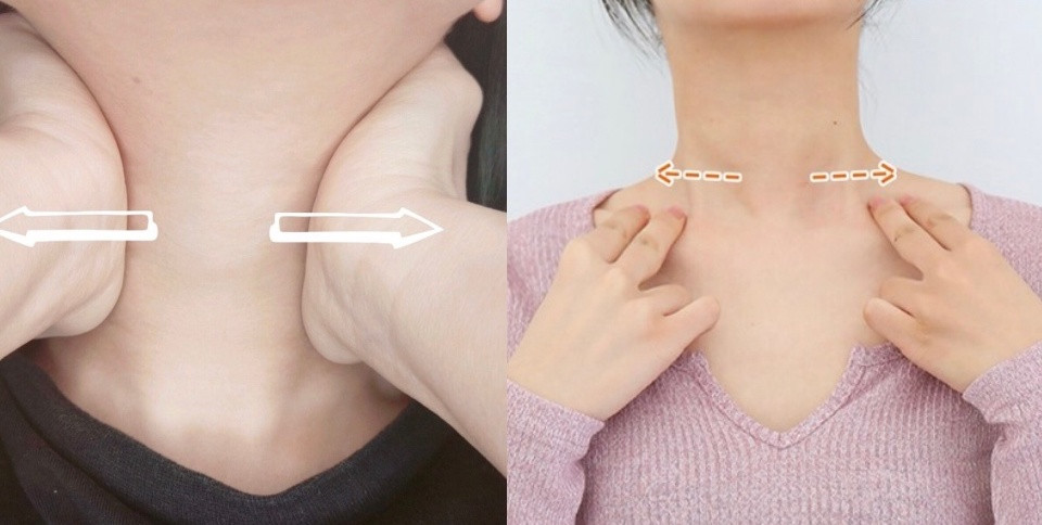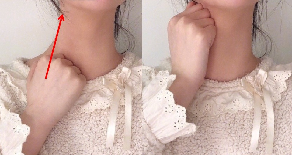 因為食指加中指的按摩力道最剛好,我們將這兩指微彎後,透過其關節來按摩。按摩位置先從下巴延伸到耳後淋巴節,接著再順著脖延伸到鎖骨處,這樣可以先是可以幫助雕塑下顎線條,擺脫雙下巴,再者可以輔助淋巴排毒,改善氣色不好、讓肌膚明亮起來。