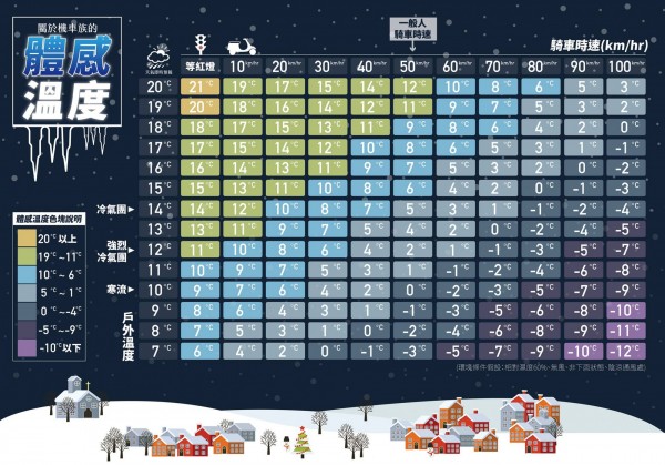 「天氣即時預報」臉書專頁日前發佈了在不同氣溫下,騎機車時的體感溫度。(圖擷取自天氣即時預報臉書專頁)