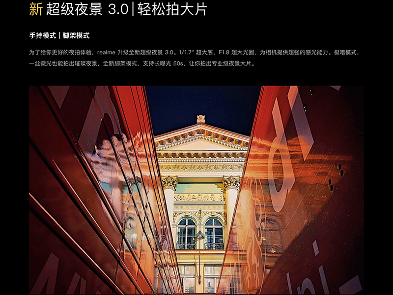 針對夜間拍攝場景, realme X50 支援超級夜景 3.0 模式,能輕鬆拍攝出更好的夜景照片。此外,也支援腳架夜景的 50 秒長曝光拍攝: